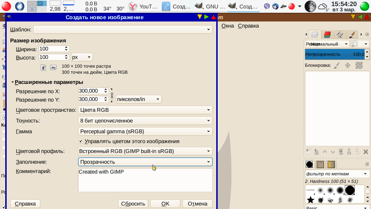 2. Файл → Создать проект → Ширина 100, Высота 100, Заполнение Прозрачность → ОК: