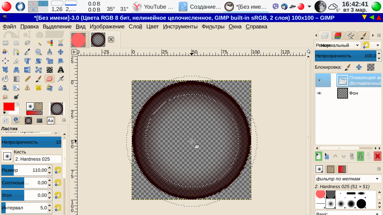 13. Инструменты → Рисование → Ластик, на панели слева выбираем самую размытую кисть Hardness 025, размер задаем чуть больше нашего черного круга. Скажем, 110. Сила 10.
