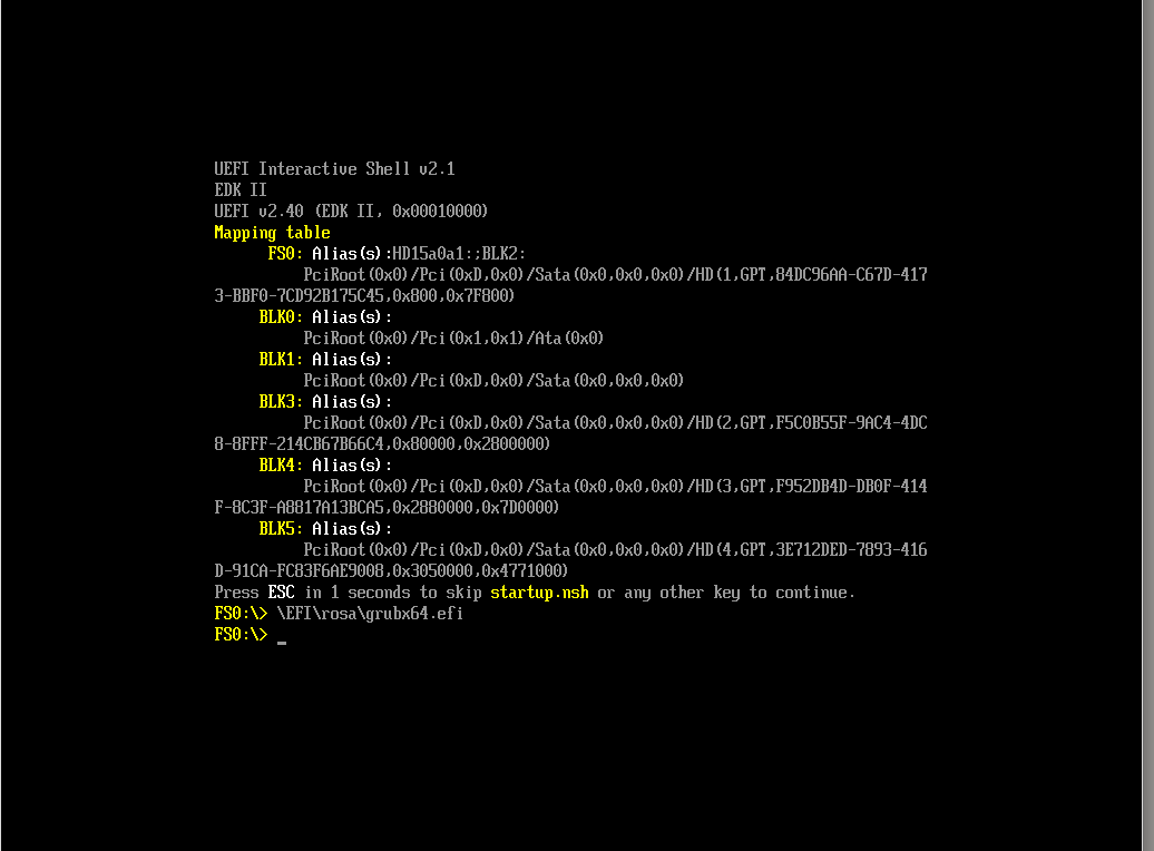 Далее жмём F2 (или Ctrl+S), Enter для сохранения файла, затем F3 (или Ctrl+Q) для выхода. Теперь можно перезагрузить машину. Через 5 секунд ожидания скрипт startup.nsh автоматически выполнится, запустив тем самым grub2.